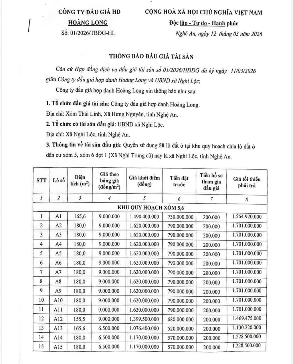 CÔNG TY ĐẤU GIÁ HD HOÀNG LONG THÔNG BÁO ĐẤU GIÁ TÀI SẢN